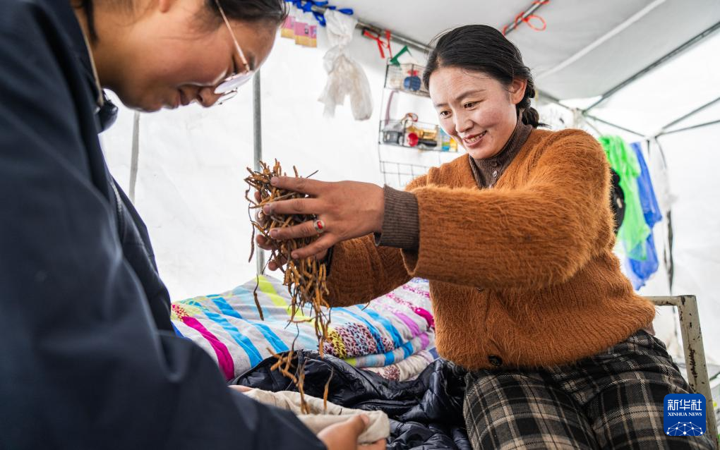 在那曲市索縣西昌鄉(xiāng),牧民白嘎在收納清理好的蟲(chóng)草(5月18日攝)。新華社記者 丁增尼達(dá) 攝
