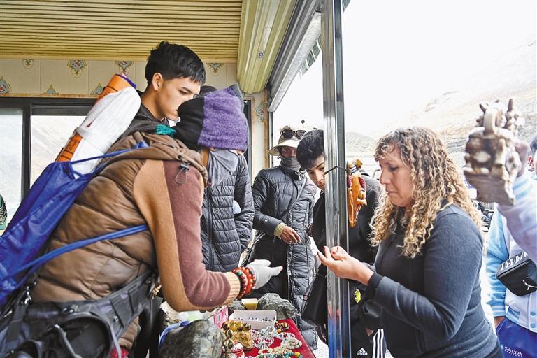 新奇感過后,游客們開啟購物模式。“阿佳,這個掛飾可以定制嗎?”“你們可以發(fā)快遞嗎?”對于一連串的問題,阿佳格桑忙碌地一一回答著,“你們想要什么圖形,我們就給你定制什么圖形。”“我們這兒快遞很快,今天下單明天就給你發(fā)!”短短半個小時,“阿佳格桑工坊”的生意火爆,銷售藏式靠墊、藏式地毯、掛飾等特色產(chǎn)品4000多元?!盎厝ズ?,我要通過自媒體平臺,宣傳這次西藏之旅的所見所聞,讓更多親朋好友來西藏旅游!”日本游客琴音有感而發(fā)。