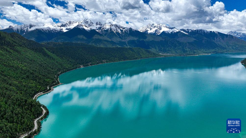 雪山環(huán)抱的巴松措(5月28日攝,無人機照片)。新華社記者 晉美多吉 攝 ??