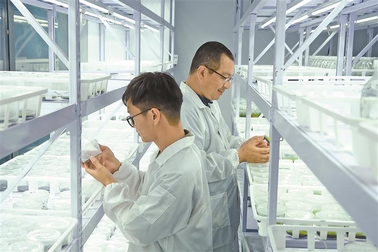 圖為基地工作人員正在檢查組織培養(yǎng)瓶里植物的長勢。