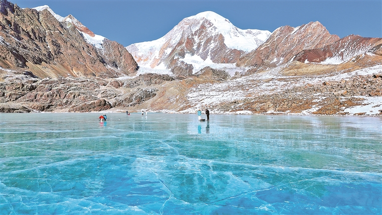 在友人的提議下,我仰面躺下。剎那間,刺骨的寒意在瞬息間由脊背侵入,高原的陽光慷慨地灑落全身,身體仿佛懸浮于冷與熱、天與地、剎那與永恒的交界,恍惚間,冰面澄澈的深處,似有熟悉的身影含笑走來,衣袂間拂動著遠(yuǎn)古的風(fēng)。一切歸于遺忘,讓人分不清這是古是今。