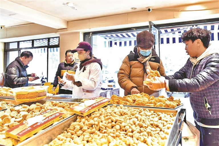 “卡塞”是一種油炸面食,是藏歷新年必備的年貨之一。橢圓形的“果子”、蝴蝶狀的“耳朵”……各色造型的“卡塞”寄托著人們對團(tuán)圓、富足的美好祈愿。店鋪里,剛出鍋的“卡塞”壘成小山,顧客絡(luò)繹不絕。