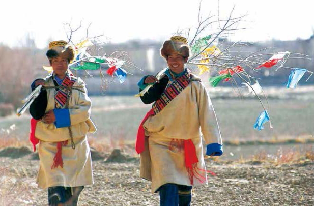 藏歷正月初三,又是一個(gè)激動(dòng)人心的日子,這一天清早起來,家家戶戶到屋頂“煨桑”。煨為漢語,是燃燒不見火焰的意思,“?!笔遣卣Z,是冒煙的意思,有人譯成“燒煙煙”、“燒神煙”,主要是煨燒香草和松枝柏葉升起裊裊香煙,驅(qū)除人間的污濁和瘟疫,祭祀鄉(xiāng)士神靈和護(hù)法神靈。接著,拔除屋頂去年插的經(jīng)幡,重新插上新的經(jīng)幡。經(jīng)幡是五種顏色的印滿經(jīng)文的布,固定在長長的柳樹枝上。據(jù)說紅色象征火焰,黃色象征土地,藍(lán)色象征天空,白色象征云彩,綠色象征江河。還有一種說法,五種顏色分別代表金、木、水、火、土五行。煨桑插旗后,人們一邊揚(yáng)撒糌粑,一邊高喊:“吉吉!索索!拉結(jié)羅!”(意思是供祭啊,供祭啊,神勝利了?。├_古城的房子都是平頂?shù)?,房舍屋宇緊緊相連。這一天成百上千的人,都站在屋頂上揚(yáng)撒糌粑,更換彩幡。糌粑粉如大雪紛飛,彩幡如鮮花怒放,祭神的呼聲此起彼伏,整個(gè)拉薩古城都成了神圣的祭壇,到處彌漫著熱烈的氣氛。
