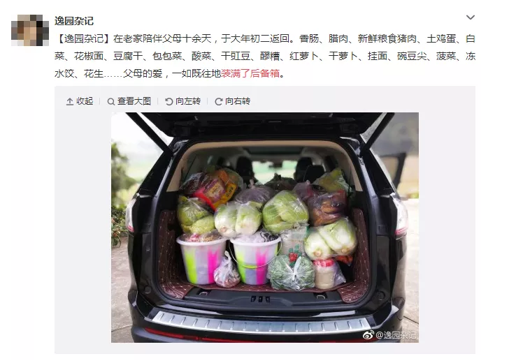 昨日,游子們從家這個(gè)港灣里,鳴笛啟航,奔向遠(yuǎn)方。除了對(duì)鄉(xiāng)愁的百轉(zhuǎn)千回,更有親情的濃郁化不開。這幾天,網(wǎng)友們都在微博里曬圖,“媽媽給裝的后備箱”的話題,一時(shí)成了熱點(diǎn)——“親手做的馬蹄糕”“最愛的家鄉(xiāng)小柚柑”“一大罐子土榨花生油”“秋天腌的糖蒜”……后備箱被爸媽塞得滿滿的,不愿帶還不高興。于是乎,調(diào)皮的網(wǎng)友留言:“明年我開個(gè)貨車回來過年!”