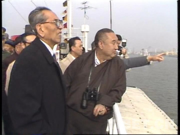 圖為1987年4月19日,十世班禪大師和阿沛o阿旺晉美率領(lǐng)援助西藏發(fā)展基金會(huì)籌備委員會(huì)委員考察天津港。