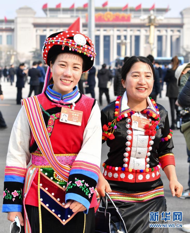3月8日,十三屆全國人大四次會議在北京人民大會堂舉行第二次全體會議。這是兩位女代表走向會場。新華社記者 賀長山 攝