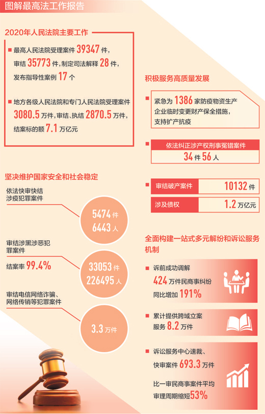 2020年,人民法院堅(jiān)定不移貫徹新發(fā)展理念,緊扣全面建成小康社會(huì)目標(biāo)任務(wù)依法履職盡責(zé),審結(jié)一審民商事案件1330.6萬件、行政案件26.6萬件,積極服務(wù)構(gòu)建新發(fā)展格局、推動(dòng)高質(zhì)量發(fā)展。