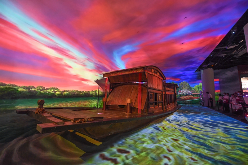 民族復(fù)興歷史任務(wù)是偉大建黨精神形成的時(shí)代背景。慶祝建黨百年之際,浙江嘉興的南湖革命紀(jì)念館迎來(lái)參觀熱潮,“紅船起航”主題展覽日均參觀人數(shù)超過10000人次。南湖革命紀(jì)念館基本陳列“紅船起航”主題展覽由“救亡圖存”、“開天辟地”、“光輝歷程”、“走向復(fù)興”4個(gè)部分組成,全面展現(xiàn)100年來(lái),中國(guó)共產(chǎn)黨團(tuán)結(jié)帶領(lǐng)中國(guó)人民取得革命、建設(shè)和改革偉大勝利的光輝歷史。圖為參觀者在南湖革命紀(jì)念館內(nèi)參觀紅船模型及多媒體場(chǎng)景重現(xiàn)。新華社記者 徐昱/攝