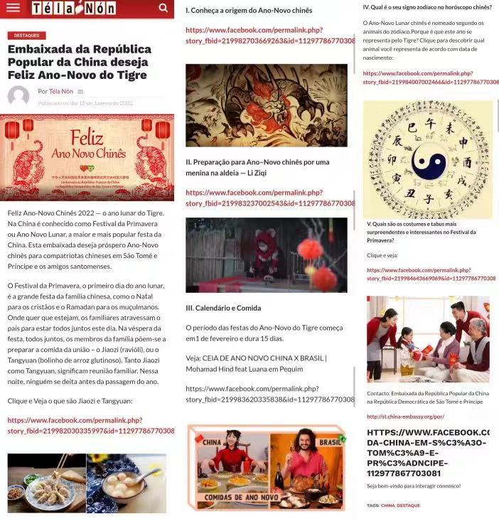 春節(jié)前夕,中國(guó)駐圣多美和普林西比使館在當(dāng)?shù)刂饕T戶網(wǎng)站特拉儂網(wǎng)(Téla Nón)設(shè)立虎年春節(jié)專欄,向廣大旅圣普僑胞、中資機(jī)構(gòu)和留學(xué)生以及圣普人民送上新春祝福,并介紹中國(guó)春節(jié)習(xí)俗趣事,掀起迎接中國(guó)新年的熱潮。
